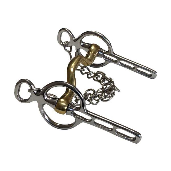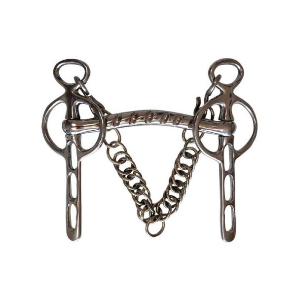 Este modelo está realizado en acero inoxidable, tiene la embocadura rígida estriada y 3 ranuras laterales. Incluye cadenilla.