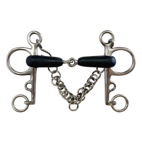 Bocado modelo Pelham con embocadura gruesa en acero inoxidable. Cadenilla incluida.