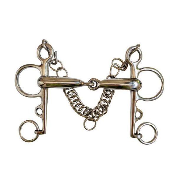 Bocado para caballo Pelham con embocadura articulada y cadenilla.