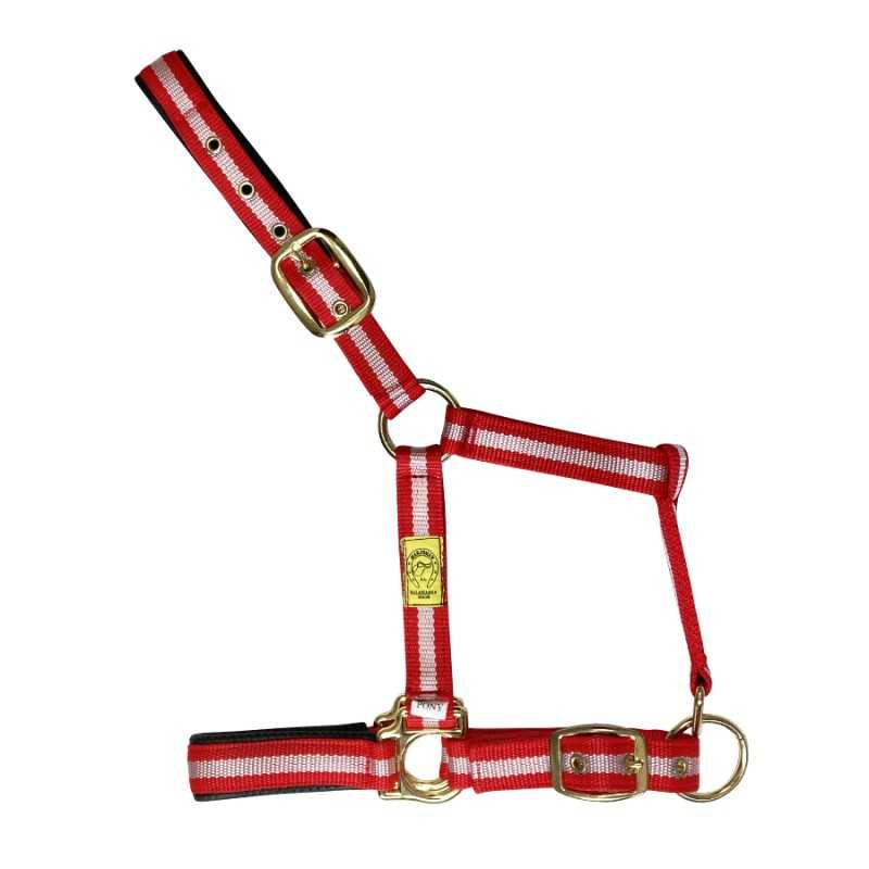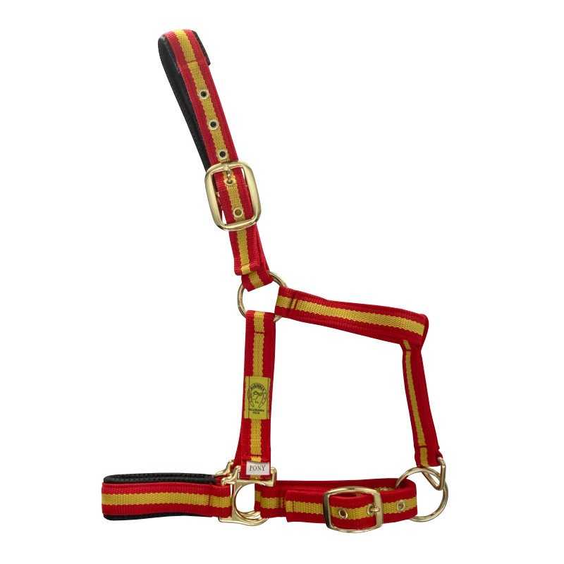 Cabezada de cuadra fabricada en nylon resistente con hebillaje dorado.
