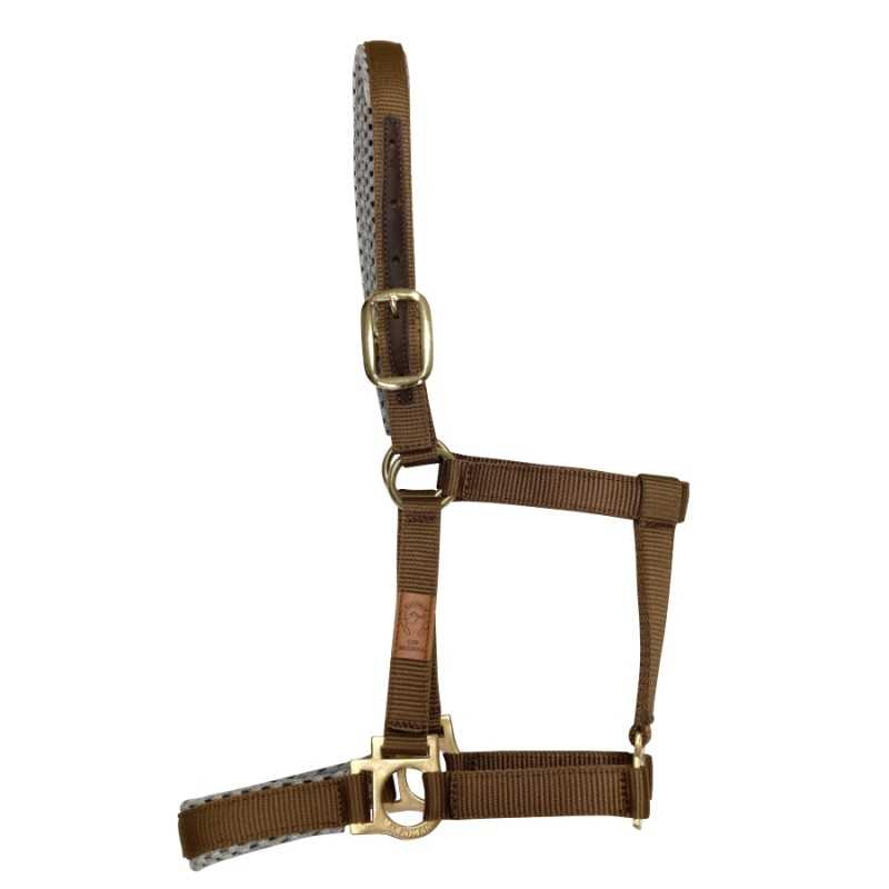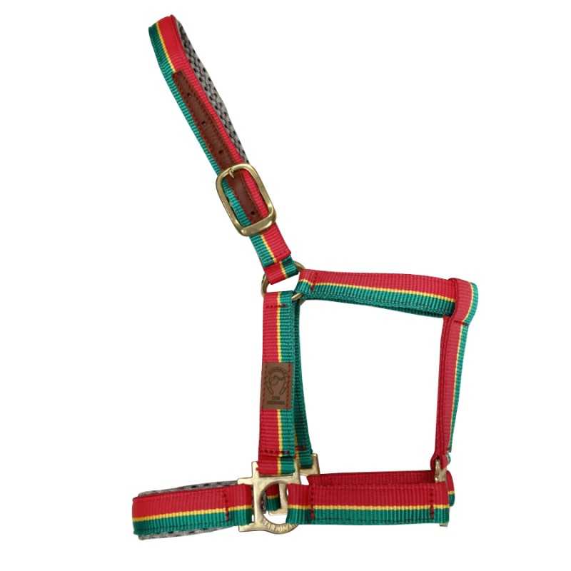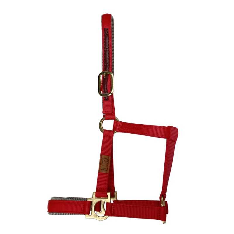 Cabezada de nylon doble plano con refuerzo de cuero en ojetes y reforzada con suave acolchado en bozo y testero. Hebillas de estampación irrompibles.