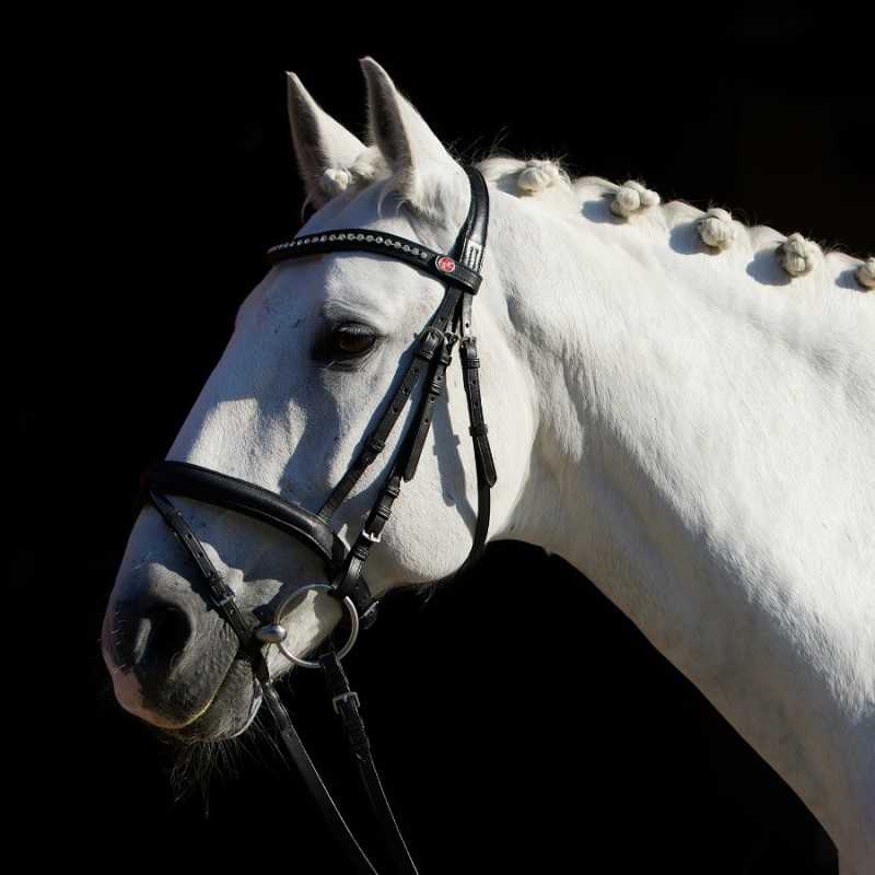 La brida de filete Kieffer Ultrasoft® FlexiStyle es una brida de diseño clásico hecha de cuero de gran calidad muy suave. El testero Professional con diseño recortado en las orejas y la muserola está suavemente acolchados. La característica especial de Kieffer Ultrasoft® FlexiStyle: esta brida está equipada con una frontalera curva Kieffer FlexiLoop® con cristales blancos. ¡El inteligente cierre rápido con dos botones de presión laterales hace que cambiar la frontalera sea mucho más fácil y permite crear una nueva apariencia en menos de un minuto! Características: Hecha de cuero suave de gran calidad – Testero Professional suavemente acolchado con diseño recortado en las orejas – La muserola con se sujeta al testero en ambos lados – Frontalera curva Kieffer FlexiLoop® decorada con cristales blancos (Diseño: Crystal Clear, 6 mm) – Hebillas cromadas – Viene con riendas de cinta