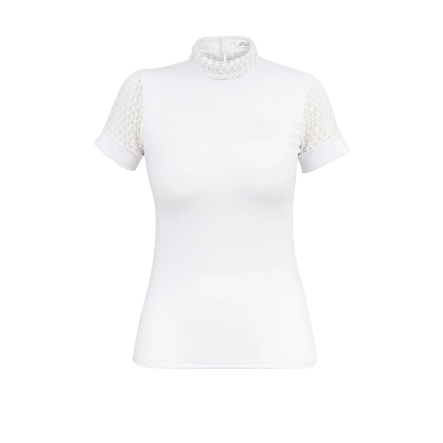 ¡Los diseñadores han ideado una camisa de concurso para mujer que es, a la vez deportiva y con encaje! Ya basta de aburridos cuellos altos blancos y lisos; Resaltemos el cuello con un interesante encaje en forma de rombo, convirtiéndolo en una pieza central de nuestra apariencia. Esta camiseta de concurso luce especialmente hermosa cuando se usa debajo de una chaqueta también de concurso, gracias a su diseño exclusivo del cuello, y cuando se quita la chaqueta, todas las miradas en la arena se centrarán en las impresionantes mangas de encaje en forma de diamante. Una obra maestra cómoda y funcionalidad elaborada con materiales técnicos.