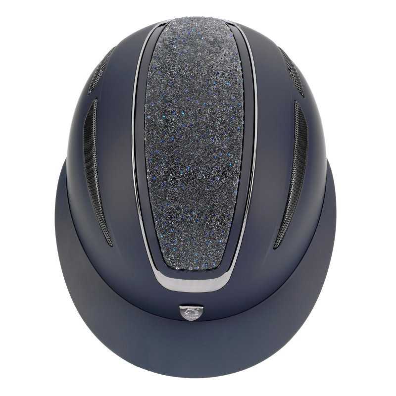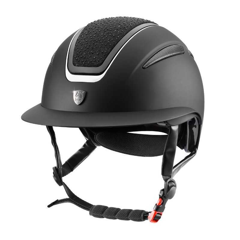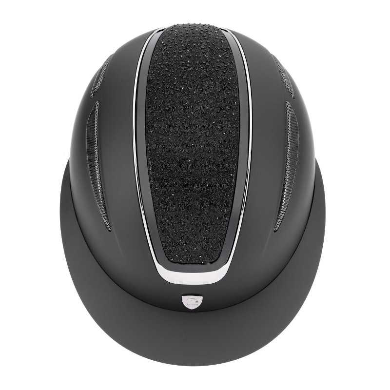 Casco hípico con brillo y cristales. visera ancha que envuelve los lados y perfiles en acero pulido.
