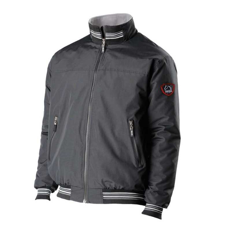 Realizada en nylon hidrorrepelente con forro en color gris perla en cálido micropolar anti-pilling de óptima calidad. Provista de cinturas, puños y parte delantera del cuello en tejido elástico de punto de algodón tono sobre tono con finas rayas en contraste, tiradores personalizados, cremallera interior trasera que ofrece la posibilidad de aplicar un bordado.