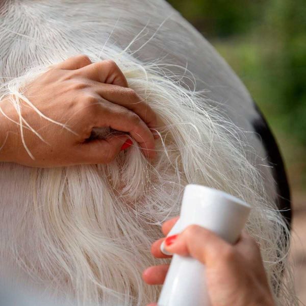 Humedecer bien el pelo, posteriormente aplicar unos 50 ml de champú sobre el dorso del caballo y repartirlo por todo el cuerpo, frotando para que penetre hasta la base de la piel. Repetir la operación sobre la cola y crines.