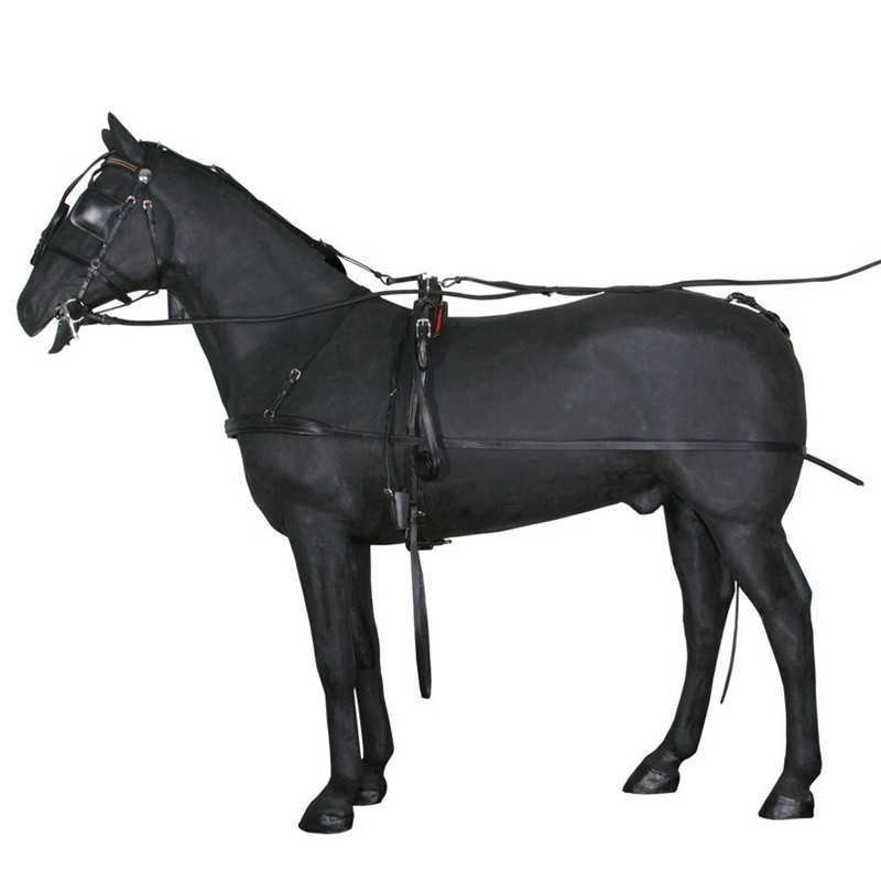 En cuero de trotón con pechopetral largo, riendas con agarradores, cincha en caucho.