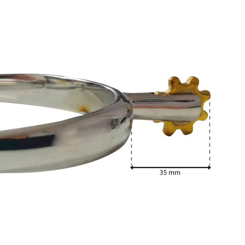 Espuela de estilo inglés para fabricada en acero inoxidable, con ruleta dorada de estrella.