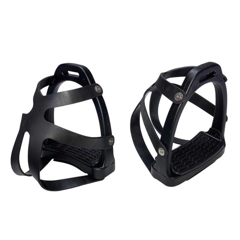 Estribos con protección delantera para raid u otras disciplinas. Taco con barras en relieve para una pisada antideslizante.