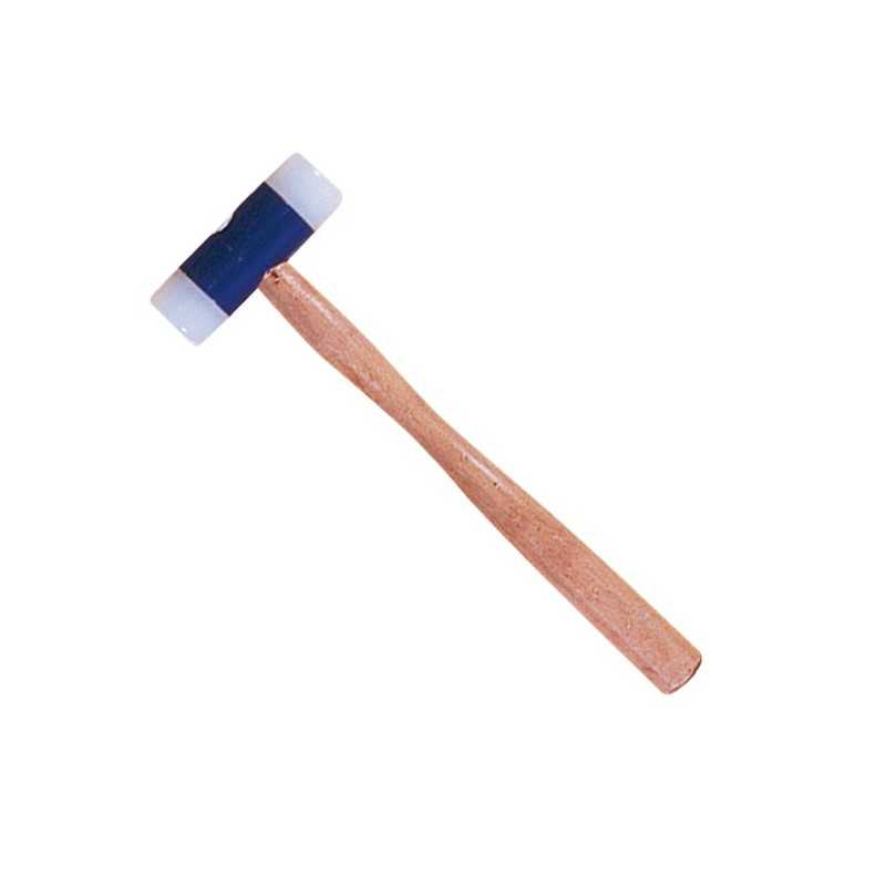 Martillo con cabeza redonda de nylon y mango de madera. Medida de la cabeza: 100 mm x 35 mm Medida del mango: 350 mm Peso: 440 gramos