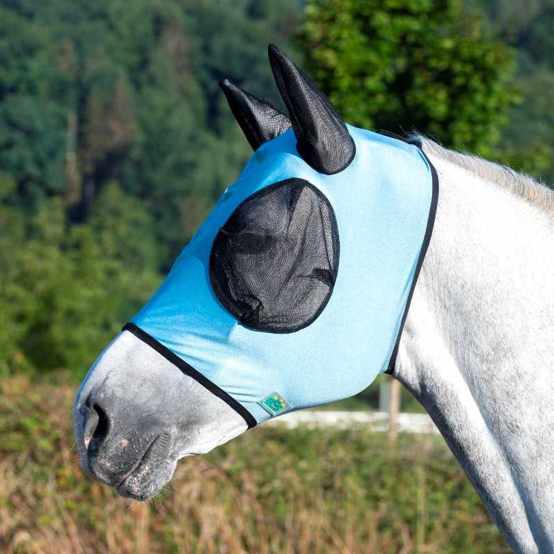 La máscara antimoscas elástica está hecha de un material ligero y elástico y tiene protección para las orejas hecha de tela de malla fina y resistente. Los ojos también están protegidos con esta malla agradable para la piel. Debido a su elasticidad, la máscara antimoscas tiene un ajuste óptimo, no pellizca y protege eficazmente contra las molestas moscas y otros insectos.