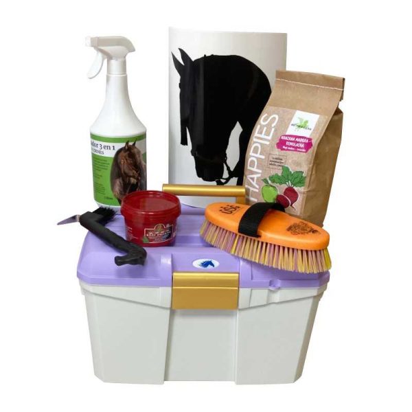 Mochila-kit de limpieza con cierre de cremallera ideal para niños/as con 6 útiles para la limpieza del caballo. Está realizada en plástico impermeable y tiene correas para la espalda regulables.