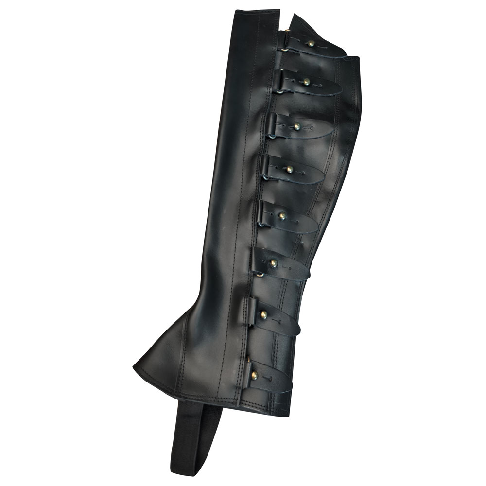 Sistema de cierre con ocho broches y hebillaje metálico dorado. Estas tradicionales remaches redondos de latón permiten adaptar la polaina sobre la pierna y ajustarla en tres posibles posiciones, según se necesite.